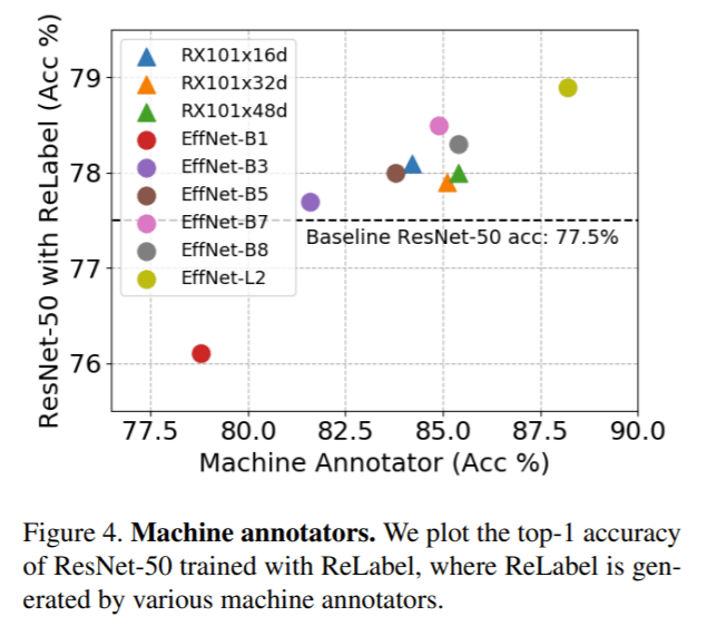 The researchers pretrained the SOTA classifiers EfficientNet- (B1,B3,B5,B7,B8), EfficientNet-L2 trained with JFT-300M , and ResNeXT-101 32x(32d,48d) trained with InstagramNet-1B. The researchers chose EfficientNet-L2 as their machine annotator, as it boosted the top-1 classification accuracy of ResNet-50 to 78.9 percent on ImageNet with the transformed and localized multi-labels, for a 1.4 percent accuracy gain compared to the baseline model trained with the original ImageNet labels.